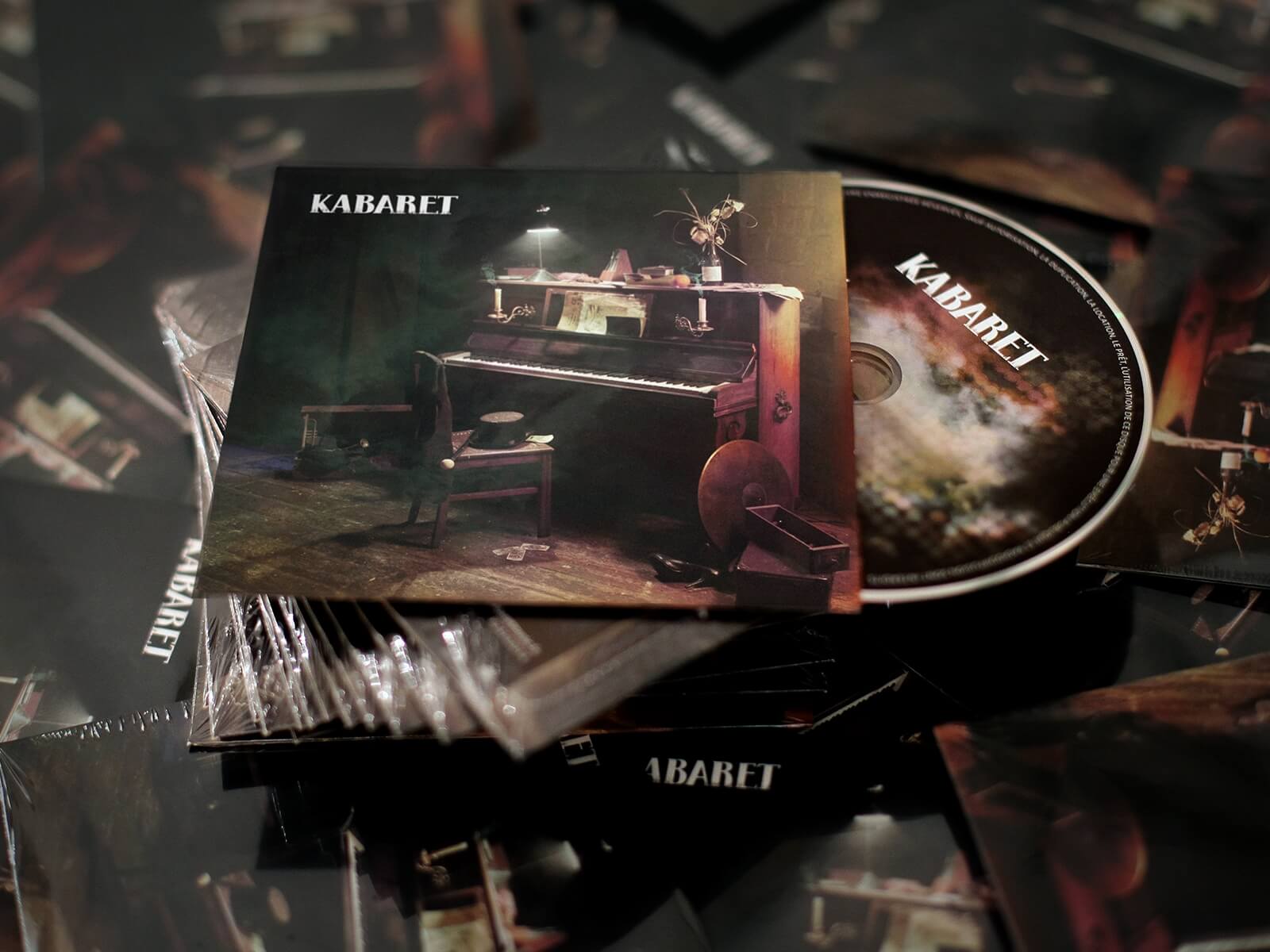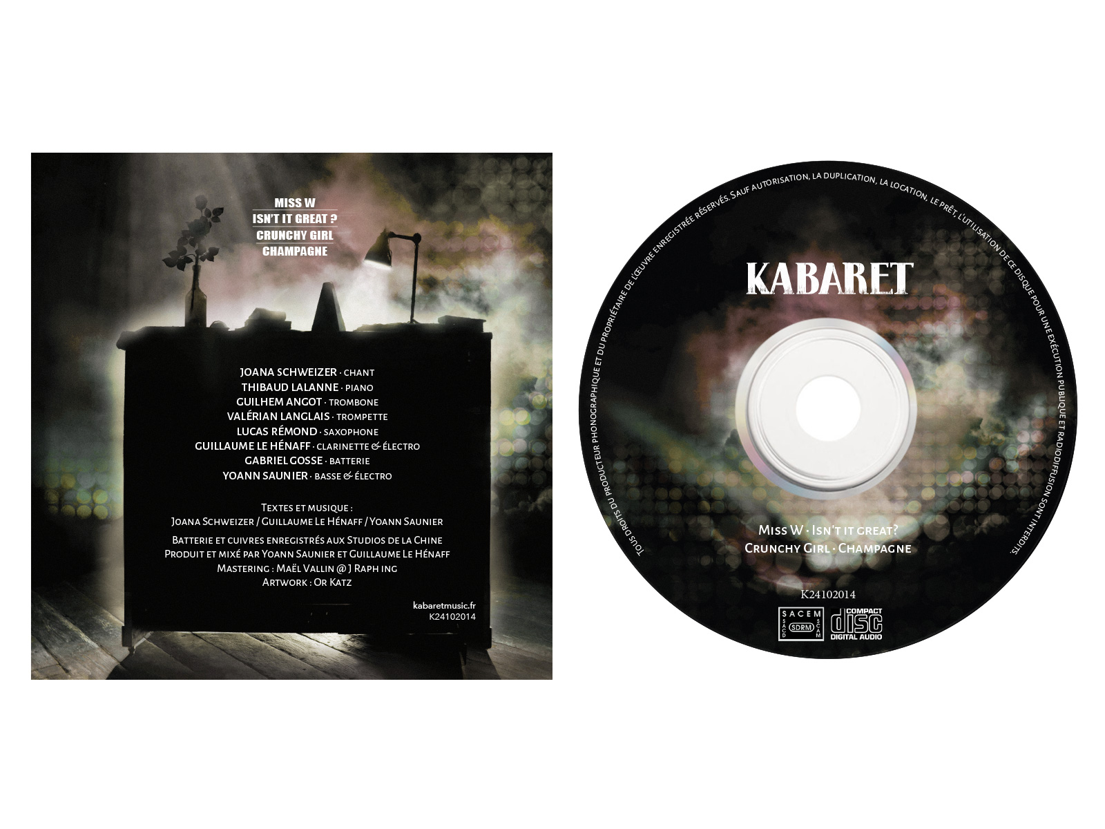 Le groupe Kabaret oscille entre le big band jazz des années 30’s et la musique électro contemporaine. Pochette du premier EP et logotype du groupe.