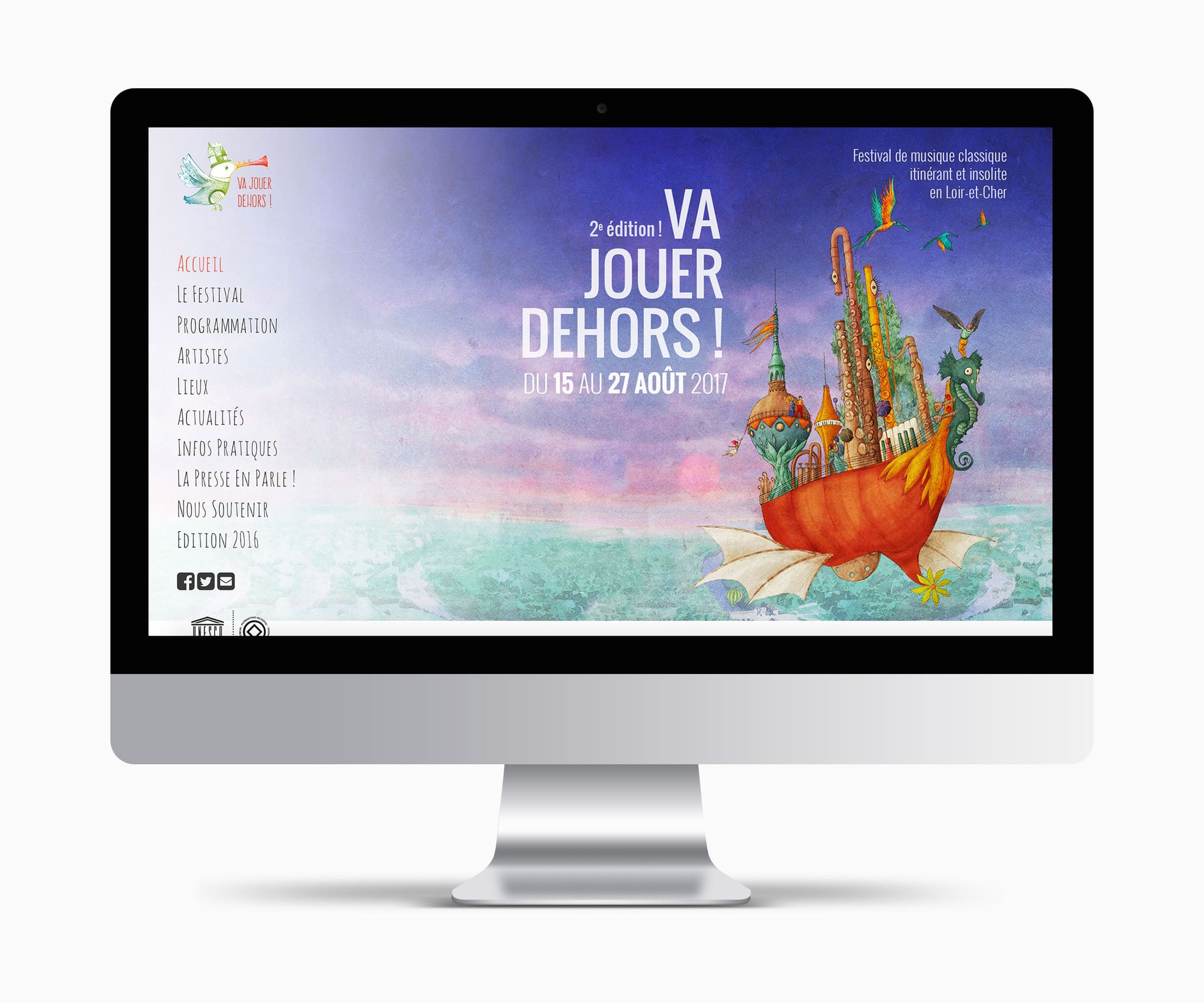 Pour la seconde édition, nous avons repris l’esprit ludique et frais de la première année, avec des illustrations hautes en couleurs invitant à la rêverie… Le visuel de l’affiche fut décliné sur le site internet et les documents de communication imprimés de l’événement.