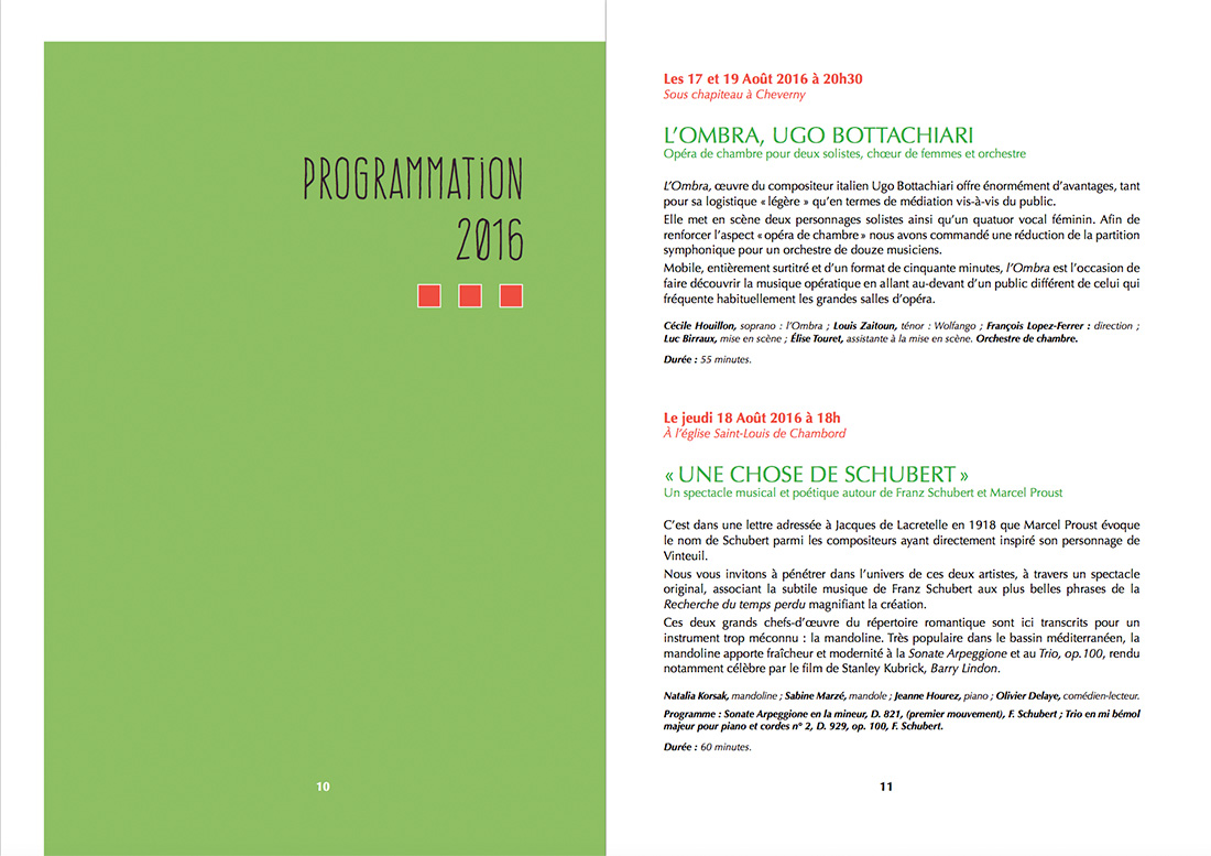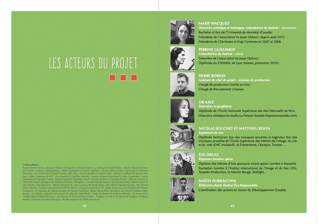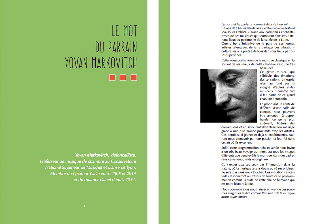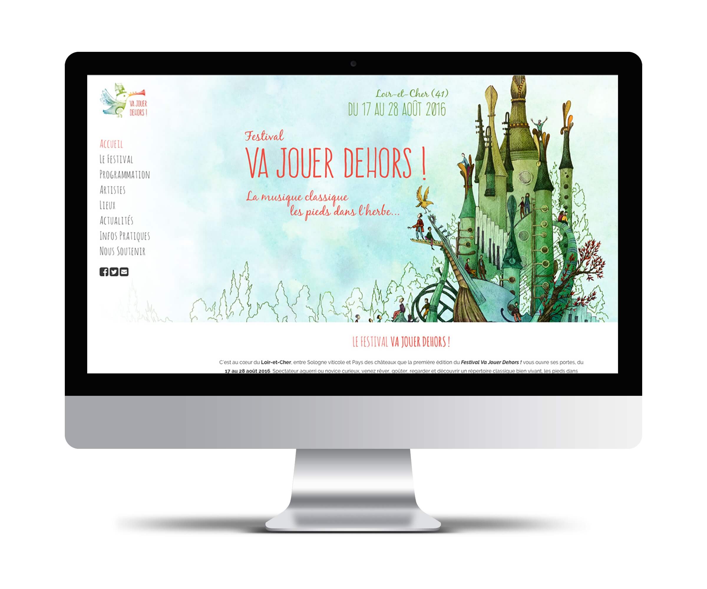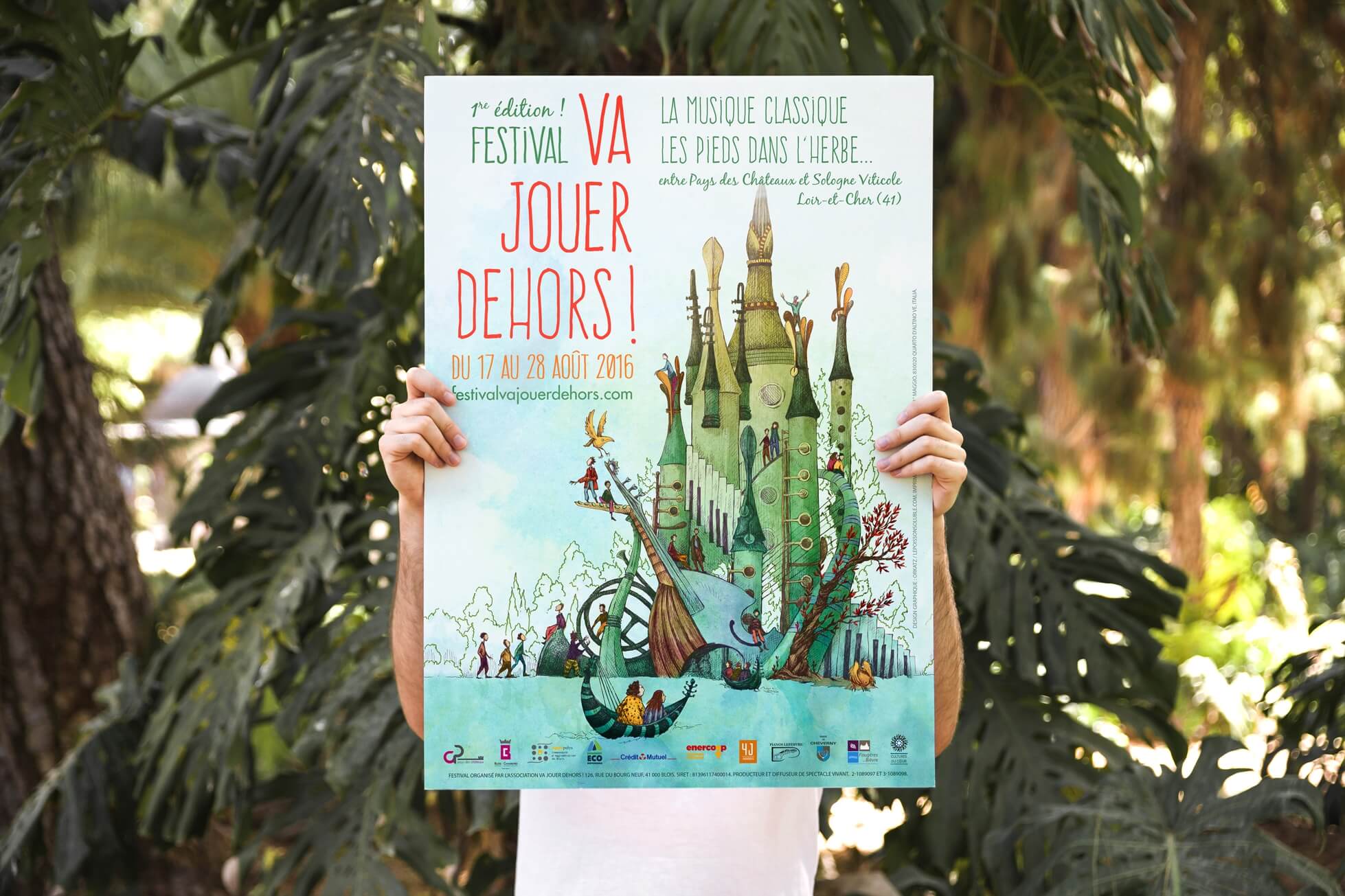 Lancé en 2016 le Festival Va Jouer Dehors ! s’est donné pour mission d’apporter la musique classique dans le cadre bucolique des Pays de la Loire. Les parcs de châteaux, les cours de ferme ou les bords de l’eau accueillent ainsi des concerts accessibles à tous les âges. Associés au lancement du projet, nous avons donné vie à l’univers ludique et coloré du festival, que nous continuons à enrichir pour la seconde édition.